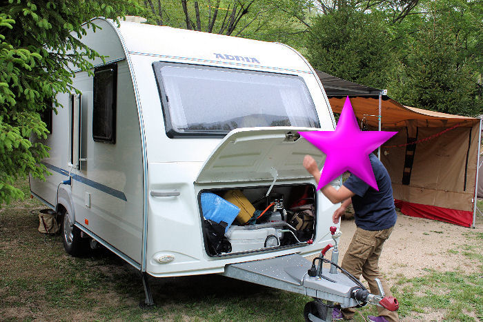 トレーラーを牽引しての羨ましいサイトです。設営も終わり、簡単に昼飯